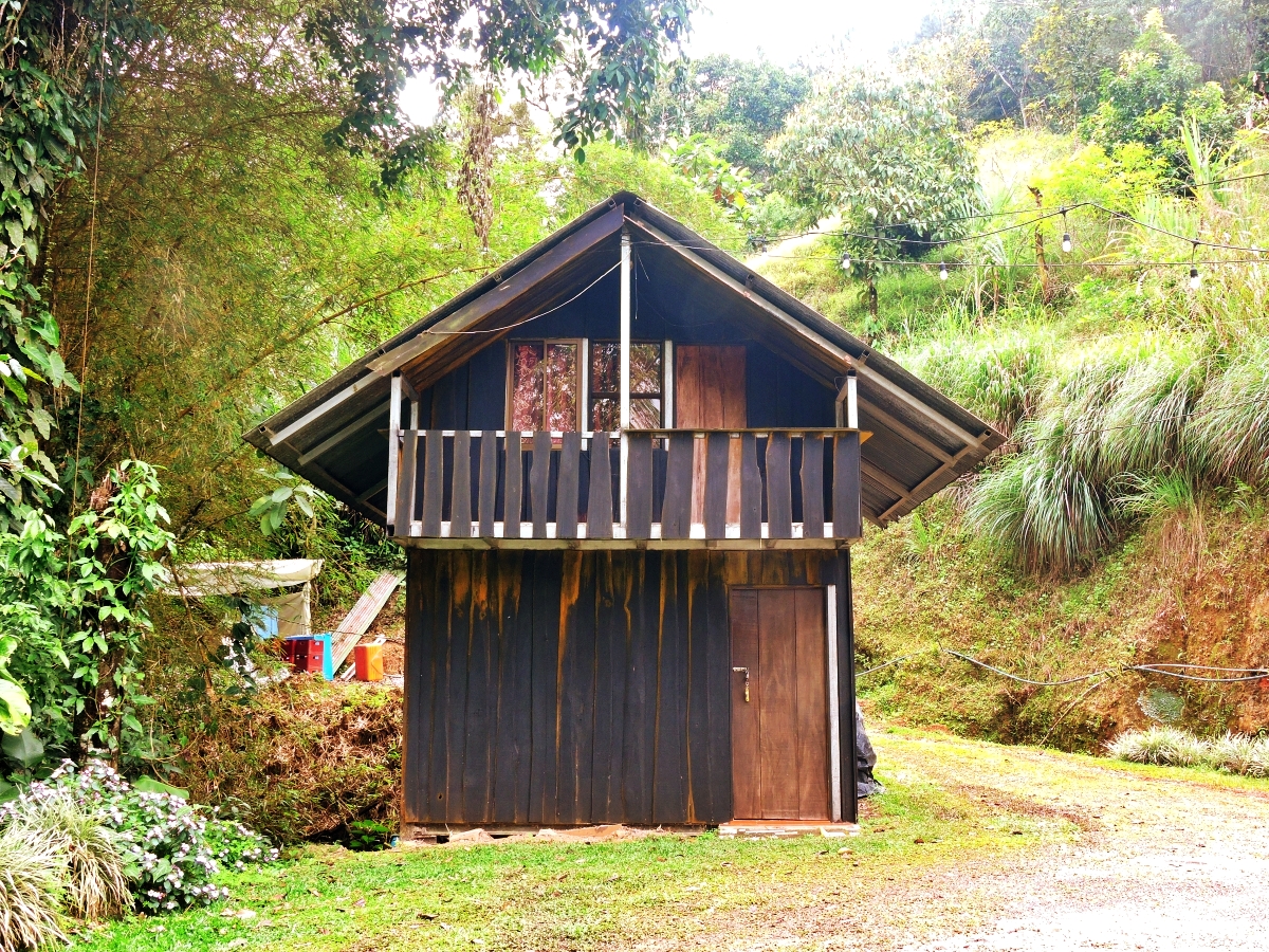 Nestled deeper into the property, surrounded by lush greenery and the soothing sounds of nature, stands a two-story rustic cabin.
