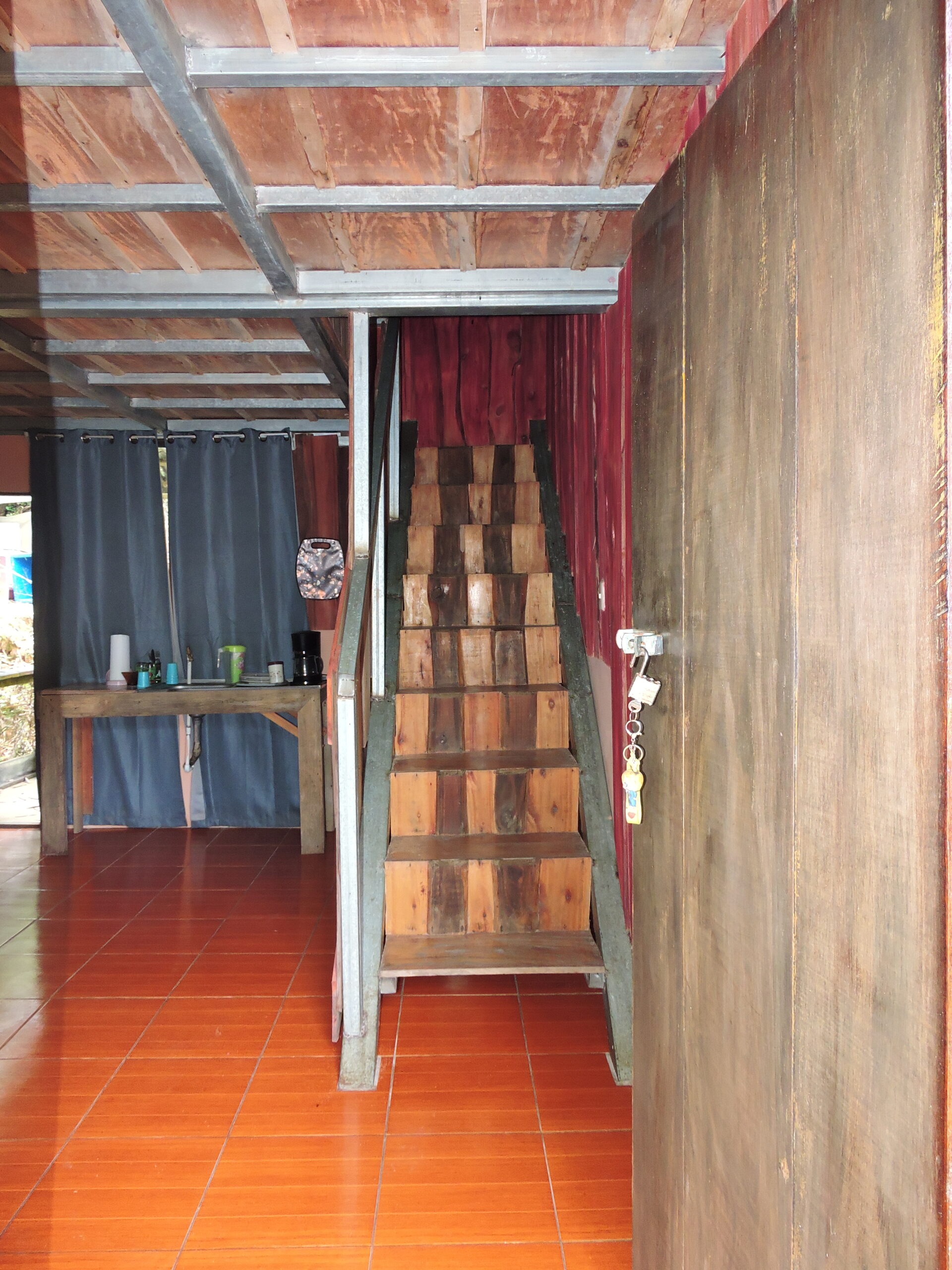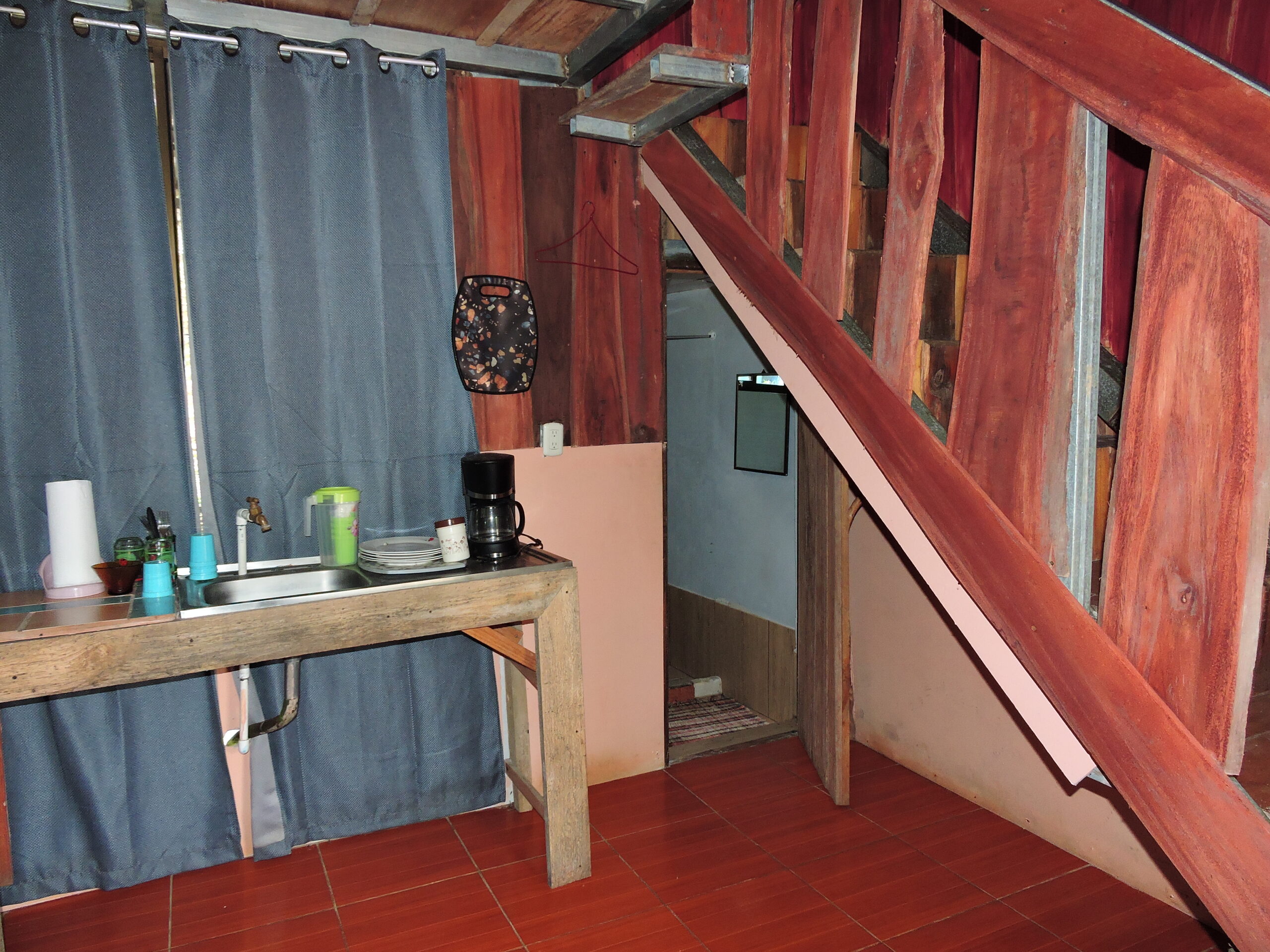 The first level includes a refrigerator, coffee maker, sink, and a full bathroom. Upstairs, you will find a bedroom with three beds and a charming balcony, perfect for enjoying views of the forest, the stream, and the lagoon.